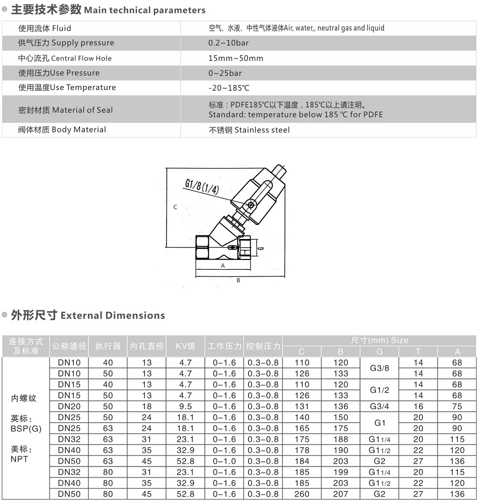 The valve is a normally closed two-position two-way piston angle seat valve. After passing through the air source, the piston pushes the valve core to move upward under the action of air pressure, and the main valve is opened, and the air source is turned off and the spring is replaced by the return spring. Main valve closed